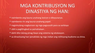 MGA KONTRIBUSYON NG DINASTIYA NG HAN. Dinasti Han terbahagi kepada kepada dua tempoh pemerintahan iaitu Dinasti Han Barat dan Dinasti Han Timur. Ang Confucianism ang naging opisyal na pilosopiya.