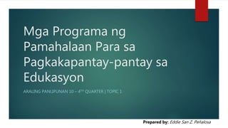 Mga Programa ng Pamahalaan Para sa Pagkakapantay-pantay sa Edukasyon ARALING PANLIPUNAN 10 4TH QUARTER TOPIC 1 Prepared by. Ang layunin ay mayroong inaasahang resulta sa huli. Para sa iba pang impormasyon tungkol sa pagsasaliksik basahin ang mga sumusunod.