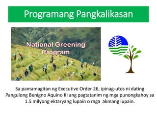 Ap 4 pinuno at proyekto ng pamahalaan 1. Sloping Agricultural Land Technology o SALT na naglulunsod ng pagtatanim sa gilid ng bundok o burol upang maiwasan ang. Natatalakay ang ibat ibang programa polisiya at patakaran ng pamahalaan at ng mga pandaidigang samahan tungkol sa Climate Change.